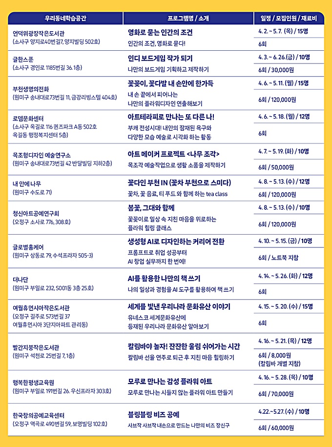 ÇÁ·Î±×·¥Àº ¡ã¿µÈ­·Î ¸¸³ª´Â Àι®ÀÇ Á¶°Ç ¡ãÀε𠺸µå°ÔÀÓ ÀÛ°¡ µÇ±â ¡ã²É²ÈÀÌ¿Í ¸¶À½Á¤¿ø °¡²Ù±â ¡ã¾ÆÆ® Å×¶óÇÇ ¡ãAI Ȱ¿ë ½Ç¹« °úÁ¤ ¡ã»ý¼ºÇü AI µðÀÚÀÎ µî Àι®¡¤¹®È­¡¤¿¹¼ú¡¤µðÁöÅÐ ºÐ¾ß¸¦ ¾Æ¿ì¸£´Â ´Ù¾çÇÑ ÁÖÁ¦·Î ±¸¼ºµÆ´Ù.