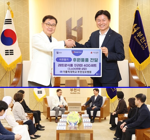 Á¶¿ëÀÍ ºÎõ½ÃÀå(¿À¸¥ÂÊ)ÀÌ 10ÀÏ ½Ãû ¸¸³²½Ç¿¡¼­ ¹ÚÀͼº ºÎõ¼º¸ðº´¿øÀå(¿ÞÂÊ)À¸·ÎºÎÅÍ ºÎõ¼º¸ðº´¿ø ¼º°¡ÀÚ¼±È¸¿¡¼­ ÁÖ°Å Ãë¾à°èÃþ À§ÇÑ ±âŹÇÑ 3õ600¸¸¿ø »ó´ç ½Äǰ ²Ù·¯¹Ì¸¦ Àü´Þ¹Þ°í ±â³äÃÔ¿µÀ» Çϰí ÀÖ´Ù. ¾Æ·¡´Â Àü´Þ½Ä ÈÄ ´ã¼Ò¸¦ ³ª´©´Â ¸ð½À.(»çÁø= ºÎõ½Ã Á¦°ø)