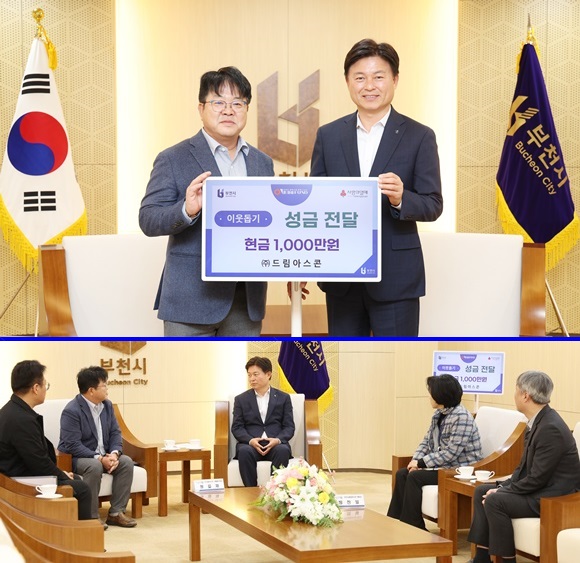 Á¶¿ëÀÍ ºÎõ½ÃÀå(¿À¸¥ÂÊ)ÀÌ ¼­Á¤À± ¢ßµå¸²¾Æ½ºÄÜ ´ëÇ¥(¿ÞÂÊ)·ÎºÎÅÍ ¼º±Ý 1õ¸¸¿øÀ» Àü´Þ¹Þ°í ±â³äÃÔ¿µÀ» Çϰí ÀÖ´Ù. ¾Æ·¡´Â Àü´Þ½Ä ÈÄ ´ã¼Ò¸¦ ³ª´©´Â ¸ð½À.(»çÁø= ºÎõ½Ã Á¦°ø)