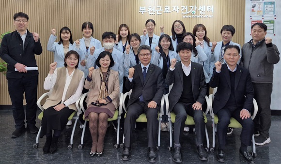 Çѱ¹»ê¾÷¾ÈÀüº¸°Ç°ø´Ü ±èÇöÁß ÀÌ»çÀåÀÌ 27ÀÏ ºÎõ±Ù·ÎÀڰǰ­¼¾Å͸¦ ¹æ¹®ÇØ Á¤Çý¼± ¼¾ÅÍÀå ¹× Á÷¿øµé°ú ¼ÒÅë °£´ãȸ¸¦ °®°í ±â³äÃÔ¿µÀÆ Çϰí ÀÖ´Ù.(»çÁø= ºÎõ±Ù·ÎÀڰǰ­¼¾ÅÍ Á¦°ø)