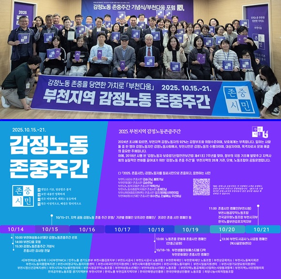 °¨Á¤³ëµ¿ Á¸Áß ÁÖ°£À» ³ë»ç°¡ ÇÔ²² ¿î¿µÇÏ´Â ºÎõµµ½Ã°ø»ç, ºÎõ¹®ÈÀç´Ü, ºÎõ¿©¼ºÃ»¼Ò³âÀç´Ü, Çѱ¹¸¸È¿µ»óÁøÈï¿ø µî 4°³ °ø°ø±â°üµé°ú ÇÔ²² ¡®°¨Á¤³ëµ¿ Á¸Áß ÁÖ°£¡¯À» ¼±Æ÷Çϰí, ÀÌÈÄ 15ÀϺÎÅÍ 21ÀϱîÁö ÀÏÁÖÀÏ µ¿¾È ¡®°¨Á¤³ëµ¿ Á¸ÁßÀ» È®»êÇϱâ À§ÇÑ ½Çõ¿¡ ÇÔ²² Çϱâ·Î ¾à¼ÓÇß´Ù.