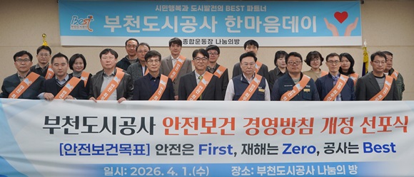 ºÎõµµ½Ã°ø»ç´Â 1ÀÏ Àü ÀÓÁ÷¿øÀÌ Âü¿©ÇÑ °¡¿îµ¥ ¾ÈÀüÀ» ÃÖ¿ì¼± °¡Ä¡·Î ÇÏ´Â ¡®¾ÈÀüº¸°Ç °æ¿µ¹æÄ§¡¯À» ³ë»ç ÇÕµ¿À¸·Î °³Á¤¡¤¼±Æ÷Çß´Ù.(»çÁø= ºÎõµµ½Ã°ø»ç Á¦°ø)
