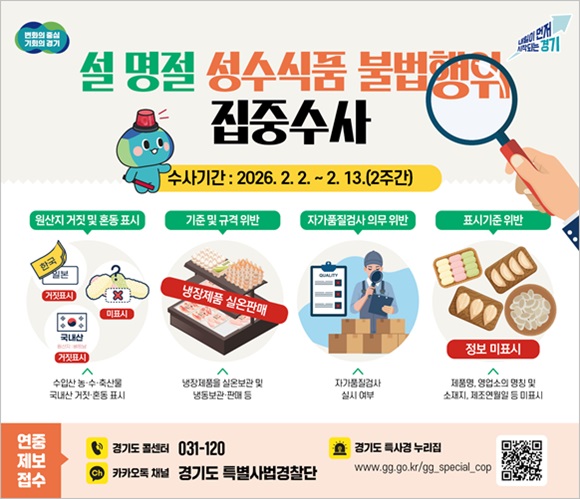 °æ±âµµ Ư»ç°æÀº ¸íÀý Àü ¼Òºñ°¡ ±ÞÁõÇÏ´Â ½Ã±â¸¦ ³ë¸° ºÒ¹ýÇàÀ§¸¦ »çÀü¿¡ Â÷´ÜÇϱâ À§ÇØ 2¿ù 2ÀϺÎÅÍ 13ÀϱîÁö µµ³» ½ÄǰÁ¦Á¶¡¤°¡°ø¾÷¼Ò¿Í Áß¡¤´ëÇü ¸¶Æ® µî 360°÷À» ´ë»óÀ¸·Î ¸íÀý ¼º¼ö½Äǰ ºÒ¹ý À¯Åë ÇàÀ§¸¦ ÁýÁß Á¡°ËÇÒ °èȹÀÌ´Ù.