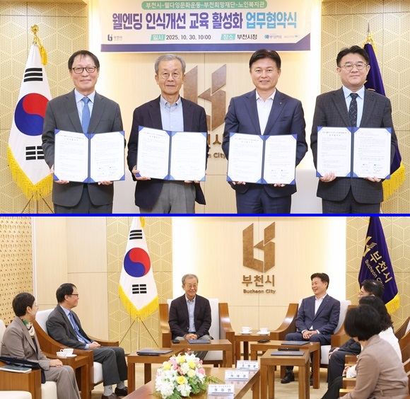 ¿ÞÂʺÎÅÍ ±è¹ü¿ë ºÎõÈñ¸ÁÀç´Ü »óÀÓÀÌ»ç, ¿øÇý¿µ (»ç)À£´ÙÀ×¹®È­¿îµ¿ ÀÌ»çÀå, Á¶¿ëÀÍ ºÎõ½ÃÀå, Á¶¿µÈÆ ¿ø¹Ì³ëÀκ¹Áö°üÀåÀÌ À£¿£µù ÀÎ½Ä °³»ê ±³À° Ȱ¼ºÈ­¡® ¾÷¹«Çù¾àÀ» ü°áÇÏ°í ±â³äÃÔ¿µÀ» Çϰí ÀÖ´Ù. ¾Æ·¡´Â Çù¾à½Ä ÈÄ ´ã¼Ò¸¦ ³ª´©´Â ¸ð½À.(»çÁø= ºÎõ½Ã Á¦°ø)