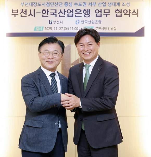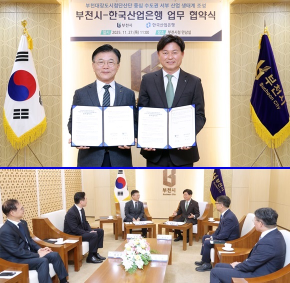 Á¶¿ëÀÍ ºÎõ½ÃÀå(¿À¸¥ÂÊ)°ú ¹Ú»óÁø Çѱ¹»ê¾÷ÀºÇà ȸÀå(¿ÞÂÊ)ÀÌ 27ÀÏ ºÎõ½Ãû 5Ãþ ¸¸³²½Ç¿¡¼­ ¡®¼öµµ±Ç ¼­ºÎ »ê¾÷ »ýŰè Á¶¼º¡¯ ¾÷¹«Çù¾àÀ» ü°áÇÏ°í ¾Ç¼ö¸¦ Çϰí ÀÖ´Ù. (»çÁø= ºÎõ½Ã Á¦°ø)