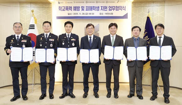 ºÎõ½Ã 7°³ ±â°üÀÌ 28ÀÏ ºÎõ½Ãû ¸¸³²½Ç¿¡¼­ ¡®Çб³Æø·Â ¿¹¹æ ¹× ÇÇÇØ Çлý Áö¿ø¡¯ ¾÷¹«Çù¾àÀ» ü°áÇß´Ù. ¿ÞÂʺÎÅÍ À̱Ôȯ ºÎõ¿ÀÁ¤°æÂû¼­Àå, ¼Õâ±Ç ºÎõ¼Ò»ç°æÂû¼­Àå, ±èÇü·ü ºÎõ¿ø¹Ì°æÂû¼­Àå, ±èº´Àü ºÎõ½ÃÀÇȸ ÀÇÀå, Á¶¿ëÀÍ ºÎõ½ÃÀå, ±èżº ºÎõ±³À°Áö¿øÃ»±³À°Àå, À̰­ÀÎ ºÎõ¿©¼ºÃ»¼Ò³âÀç´Ü ´ëÇ¥ÀÌ»ç.(»çÁø= ºÎõ½Ã Á¦°ø)