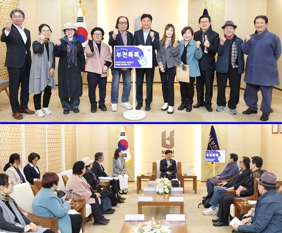 Á¶¿ëÀÍ ºÎõ½ÃÀåÀÌ ½Ã û»ç °ßÇÐ ÇÁ·Î±×·¥ ¡®210, ºÎõÅåÅ塯 ÀÏȯÀ¸·Î ½ÃûÀ» ¹æ¹®ÇÑ ¡®ºÎõÀÛ°¡È¸ÀÇ¡¯ ȸ¿øµé°ú ±â³äÃÔ¿µÀ» Çϰí ÀÖ´Ù. ¾Æ·¡´Â ´ëÈ­¸¦ ³ª´©´Â ¸ð½À.(»çÁø= ºÎõ½Ã Á¦°ø)