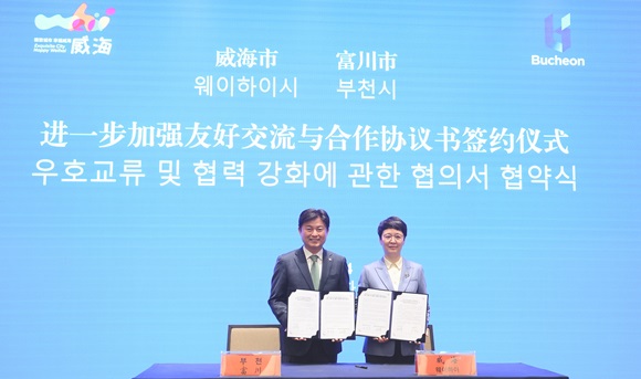 Á¶¿ëÀÍ ºÎõ½ÃÀå(¿ÞÂÊ)ÀÌ 4ÀÏ ÄôÆÇÇÎ ¿þÀÌÇÏÀ̽ÃÀå°ú ¿ìÈ£±³·ù ¹× Çù·Â °­È­¿¡ °üÇÑ Çù¾àÀ» ü°áÇÏ°í ±â³ÈÃÔ¿µÀ» Çϰí ÀÖ´Ù.(»çÁø= ºÎõ½Ã Á¦°ø)