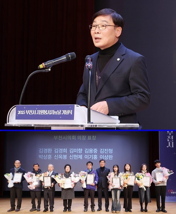 ±èº´Àü ºÎõ½ÃÀÇȸ ÀÇÀåÀÌ 4ÀÏ ¿­¸° ¡®2025 ºÎõ½Ã ÀÚ¿øºÀ»çÀÚÀÇ ³¯ ±â³ä½Ä¡¯¿¡¼­ Ãà»ç¸¦ Çϰí, ÀÇÀå ǥâ ¼ö»óÀÚµé°ú ±â³äÃÔ¿µÀ» Çϰí ÀÖ´Ù.(»çÁø= ºÎõ½ÃÀÇȸ Á¦°ø)