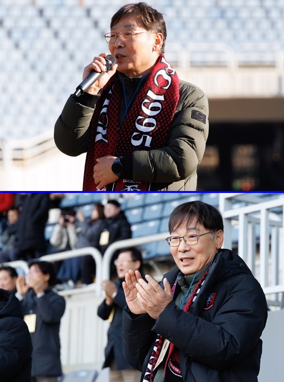 ±èº´Àü ºÎõ½ÃÀÇȸ ÀÇÀåÀÌ 7ÀÏ ºÎõÁ¾ÇտÀå¿¡¼­ ¿­¸° ºÎõFC 2026½ÃÁð K¸®±×1(1ºÎ¸®±×) Ȩ°³¸·Àü¿¡¼­ Ãà»ç¸¦ Çϰí ÀÖ´Ù, ¾Æ·¡´Â °æ±â¸¦ °ü¶÷ÇÏ¸ç ºÎõFC¸¦ ÀÀ¿øÇÏ´Â ¸ð½À.(»çÁø= ºÎõ½ÃÀÇȸ Á¦°ø)