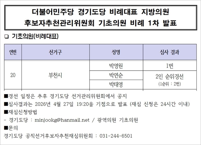 1Â÷ ¹ßÇ¥ °á°ú, ºÎõ½ÃÀÇ¿ø ºñ·Ê´ëÇ¥ 1¹øÀº ¹Ú¿µ¿ø ¿¹ºñÈÄ º¸(1987³â»ý¤ý38) Çö À̰ÇÅ ±¹È¸ÀÇ¿ø È«º¸¼ÒÅëÆ¯º¸(Àü ´õºÒ¾î¹ÎÁÖ´ç Áß¾Ó´ç È«º¸±¹ Â÷Àå)°¡ È®Á¤µÆ´Ù. ¢º°ü·Ã±â»ç Ŭ¸¯