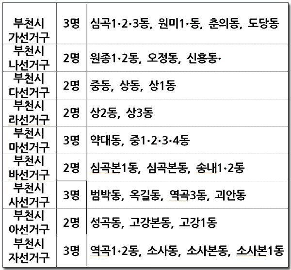 ºÎõ½ÃÀÇ¿ø 10°³ ¼±°Å±¸´Â 9°³ ¼±°Å±¸·Î 1°³ ¼±°Å±¸°¡ °¨¼ÒÇϰí, Áö¿ª±¸ ½ÃÀÇ¿ø Á¤¼ö°¡ 24¸í¿¡¼­ 22¸íÀ¸·Î 2¸íÀÌ °¨¼ÒÇÏ°Ô µÈ´Ù.