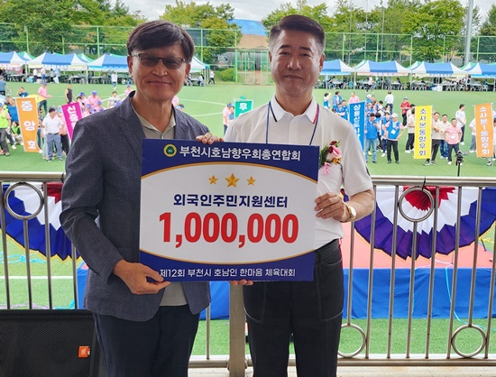 °­¿Áµ¿ ºÎõ½ÃÈ£³²Çâ¿ìȸÃÑ¿¬ÇÕȸ ÃÑȸÀå(¿À¸¥ÂÊ)ÀÌ Áö³­ 9¿ù 13ÀÏ ¡®Á¦12ȸ ºÎõ½Ã È£³²ÀÎ ÇѸ¶À½ üÀ°´ëȸ¡¯¿¡¼­ ¹é¼±±â ºÎõÀÌÁÖ¹ÎÁö¿ø¼¾ÅÍÀå¿¡°Ô ÀÌÁֹεéÀ» À§ÇÑ ÈÄ¿ø±Ý 100¸¸¿øÀ» Àü´ÞÇÏ°í ±â³äÃÔ¿µÀ» Çϰí ÀÖ´Ù.(»çÁø= ºÎõÀÌÁÖ¹ÎÁö¿ø¼¾ÅÍ Á¦°ø)