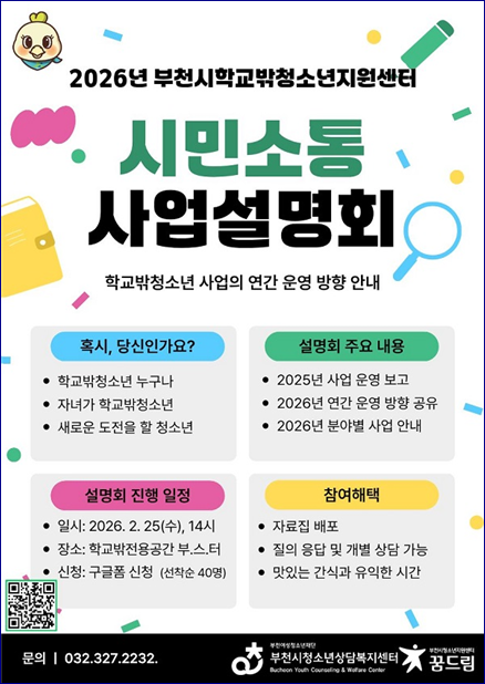 ºÎõ½Ã Çб³¹Ûû¼Ò³âÁö¿ø¼¾ÅÍ »ç¾÷¼³¸íȸ´Â Çб³¹Ûû¼Ò³â, º¸È£ÀÚ, À¯°ü±â°ü, Áö¿ª½Ã¹Î°ú ÇÔ²² ¿ÃÇØ ¿î¿µ ¹æÇâÀ» °øÀ¯ÇÏ´Â ÀÚ¸®·Î, û¼Ò³âÀÌ ÀÚ½ÅÀÇ »î°ú Áø·Î¸¦ ½º½º·Î ±âÈ¹ÇØ º¸´Â ½Ã°£À¸·Î ±¸¼ºµÅ ´Ü¼øÇÑ »ç¾÷ ¾È³»¸¦ ³Ñ¾î û¼Ò³âÀÇ ÁÖµµÀû ¼ºÀå°ú Âü¿© Áß½ÉÀÇ ¿î¿µ ¹®È¸¦ ¸¸µé¾î°¡´Â °è±â¸¦ ¸¶·ÃÇÑ´Ù.