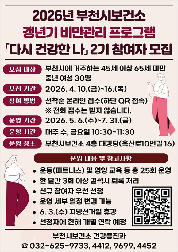 Âü¿©¸¦ Èñ¸ÁÇÏ´Â ´ë»óÀÚ´Â 4¿ù 10ÀϺÎÅÍ 16ÀϱîÁö Æ÷½ºÅÍ¿¡ ÀÖ´Â QRÄڵ带 ÅëÇØ ½ÅûÇÒ ¼ö ÀÖ´Ù. ¸ðÁý ÀοøÀº 30¸íÀÌ¸ç ¼±Âø¼øÀ¸·Î Á¢¼öÇÑ´Ù. ÀÚ¼¼ÇÑ »çÇ×Àº ºÎõ½Ãº¸°Ç¼Ò ȨÆäÀÌÁö(pubhealth.bucheon.go.kr¤ý¹Ù·Î °¡±â Ŭ¸¯)¸¦ È®ÀÎÇϰųª °Ç°­ÁõÁø°ú(¢Ï032-625-4412)·Î ¹®ÀÇÇÏ¸é µÈ´Ù.