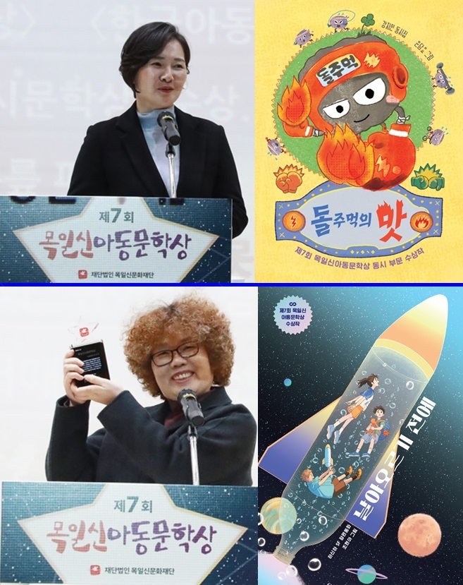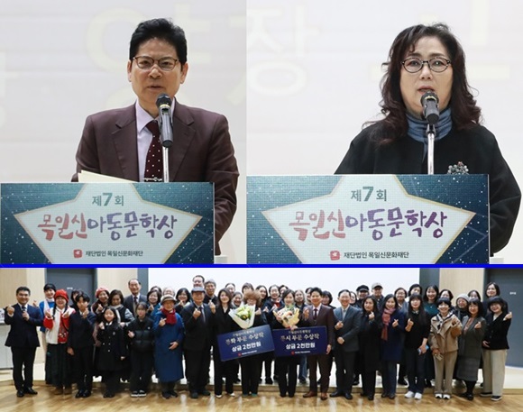 Á¦7ȸ ¸ñÀϽžƵ¿¹®ÇÐ»ó µ¿½Ã ºÎ¹® ¼ö»óÀÚ °­ÁöÀÎ ÀÛ°¡(¿ÞÂÊ), µ¿È­ ºÎ¹® ¼ö»óÀÚ ÇϽÅÇÏ ÀÛ°¡(¿À¸¥ÂÊ)°¡ ¼ö»ó ¼Ò°¨À» ÀüÇϰí ÀÖ´Ù(»çÁø= ¸ñÀϽŹ®È­Àç´Ü Á¦°ø)