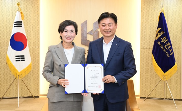 Á¶¿ëÀÍ ºÎõ½ÃÀåÀÌ Áö³­ 1ÀÏ ½Ãû 5Ãþ ¸¸³²½Ç¿¡¼­ ¹ÚÀºÇý ºÎõ¾ÆÆ®¼¾ÅÍ ´ëÇ¥À̻翡°Ô ÀÓ¸íÀåÀ» ¼ö¿©ÇÏ°í ±â³äÃÔ¿µÀ» Çϰí ÀÖ´Ù.(»çÁø= ºÎõ¾ÆÆ®¼¾ÅÍ Á¦°ø)