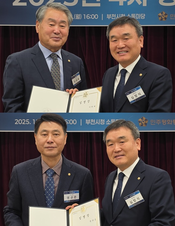 ½É¹æ½Ä ¹ÎÁÖÆòÈ­ÅëÀÏÀÚ¹®È¸ÀÇ ºÎõ½ÃÇùÀÇȸÀå(»çÁø ¿À¸¥ÂÊ)ÀÌ ÀÌÈñÅ ÀÚ¹®À§¿ø(À§)°ú ¾ä±ÔÁØ ÀÚ¹®À§¿ø(¾Æ·¡)À» »óÀÓ ºÎȸÀåÀ¸·Î À§ÃËÇÏ°í ±â³äÃÔ¿µÀ» Çϰí ÀÖ´Ù.(»çÁø= ¹ÎÁÖÆòÅë ºÎõ½ÃÇùÀÇȸ Á¦°ø)
